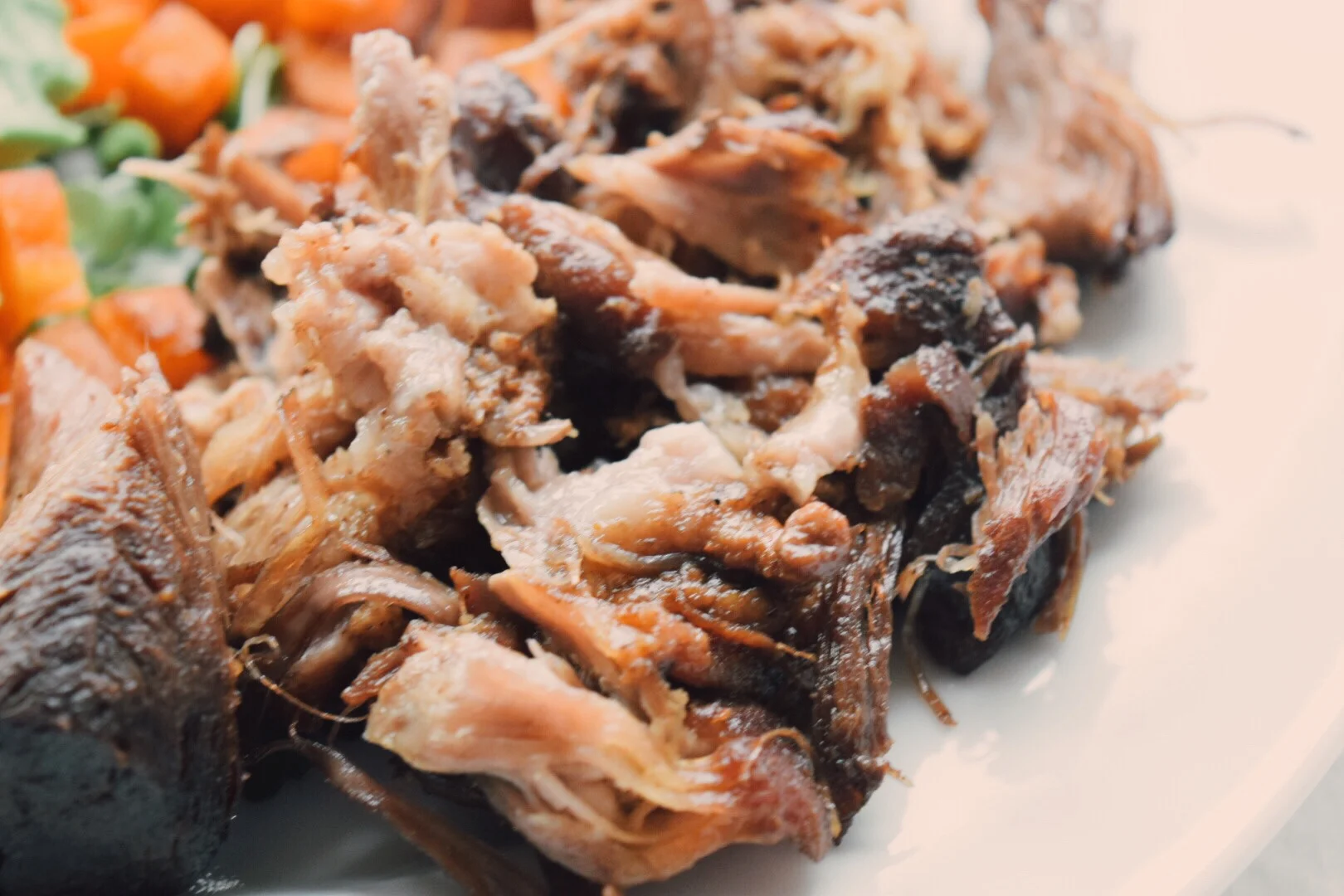 7. OMG IT'S SO CRISPY!!! But not ready to eat yet. Once the timer goes off take your pan out, put the meat on a plate and discard of the liquid int he roasting pan. Pull apart the pork and add it back to the pan. Put it back in the oven and continue roasting until it's super crispy or you just can't take it any longer. Roughly 30 minutes.